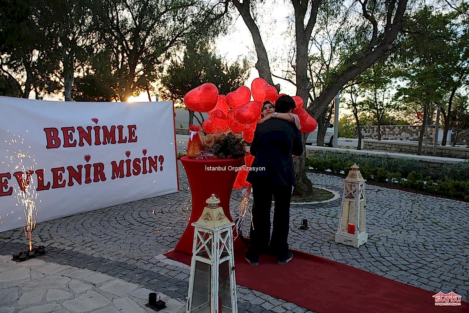 İstanbul Organizasyon ekibimiz Cansu Hanım ve Burak Beyi beklerken, çiftimiz de el ele tutuşarak bize doğru geliyordu. Ekip arkadaşımız uçan balonları Cansu Hanım’a iletti. Yer volkanları eşliğinde kırmızı halıdan yürüyen çiftimiz uzun uzun birbirine sarıldı. Ardından ise Burak Bey diz çökerek ‘Benimle Evlenir Misin’ diye sordu Cansu Hanıma. ‘Evet‘ cevabı ile bir kez daha yer volkanları ateşlendi. Uçan balonları gökyüzüne bırakan çiftimiz dans ederek romantik dakikalar yaşadı. Çiçek buketini Canan Hanım’a takdim eden Burak Bey ardından eş adayı ile fotoğraf çektirerek bu anları ölümsüzleştirdi. Alaçatı Yel Değirmenlerinde sürpriz evlilik teklifi organizasyonu ile İstanbul Organizasyon firmamız bir kez daha unutulmayacak anlara imza attı. Evlilik teklifi organizasyonu ile ilgili ayrıntılı bilgi almak için evlilikteklifi.com sitemizi ziyaret edebilir ya da İstanbul Organizasyon firmamıza ulaşabilirsiniz.