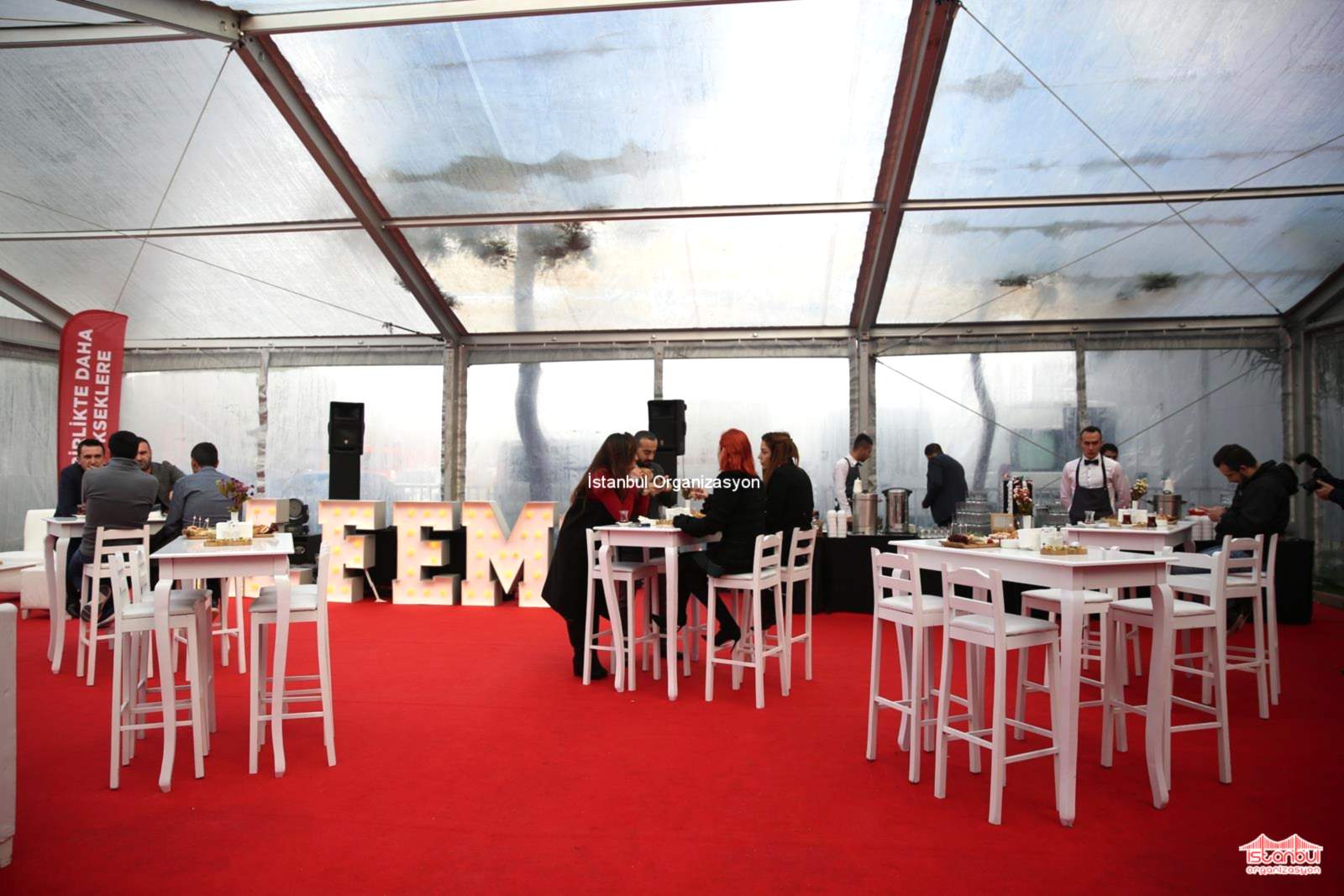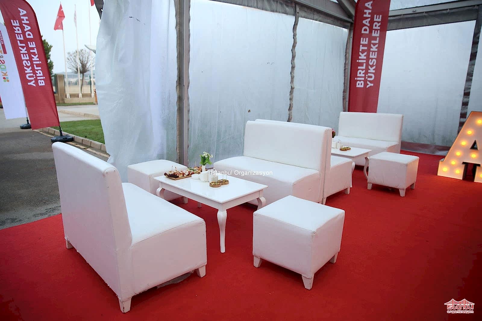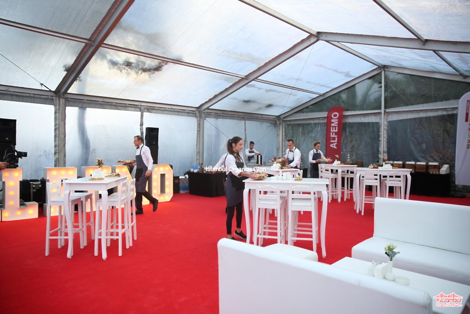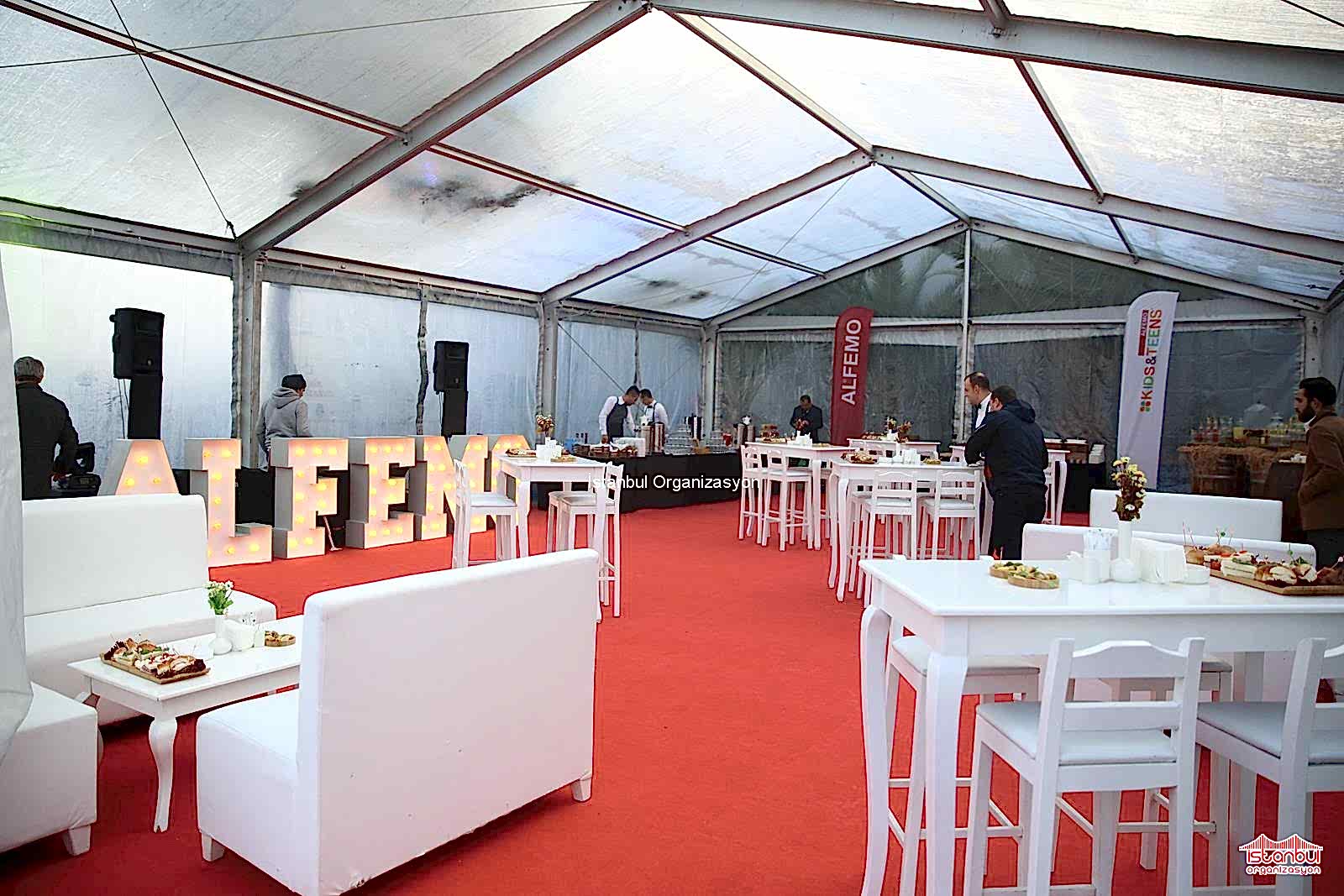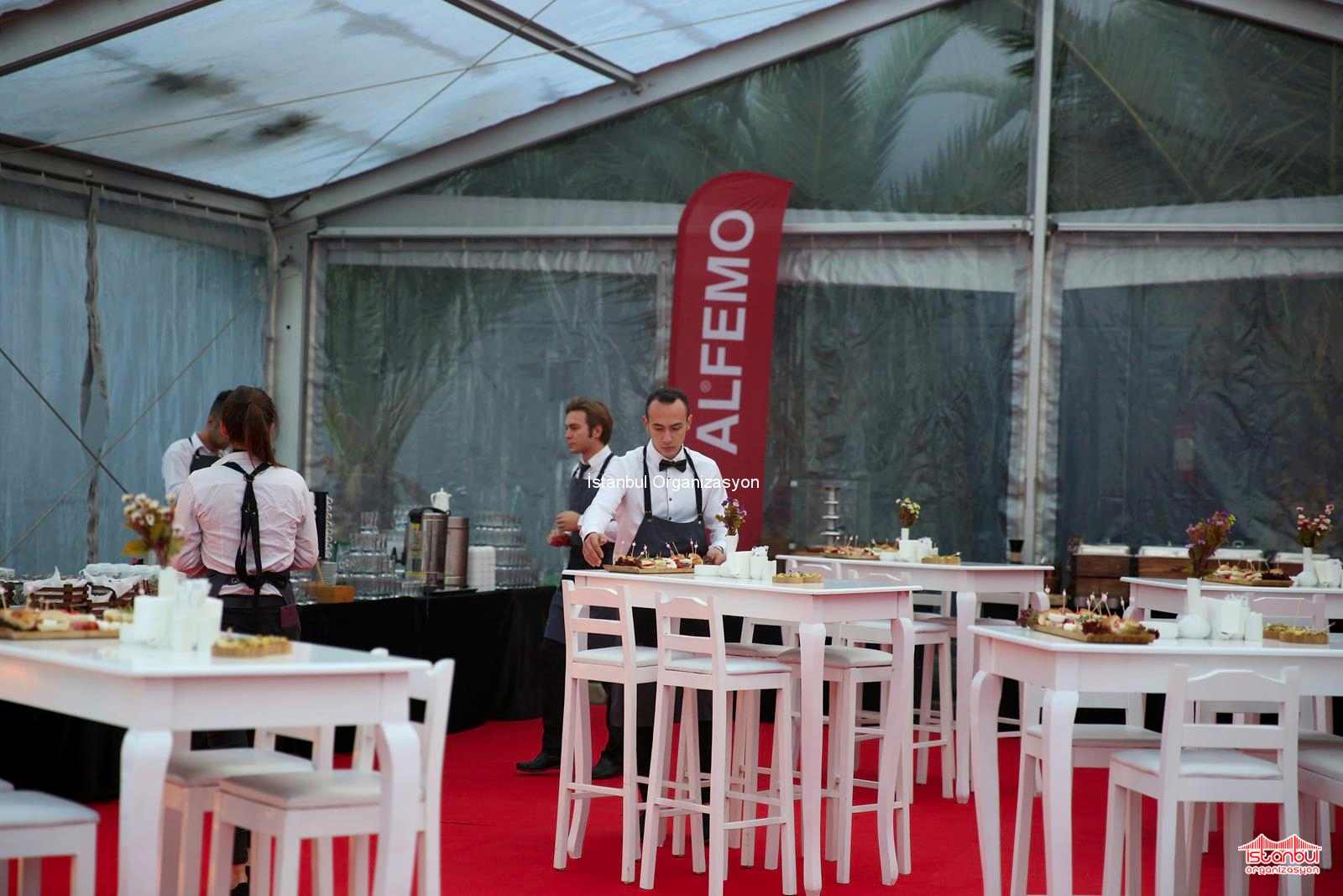 Alfemo Mobilya bayi toplantısı organizasyonu için puf oturma grubu, masa ve sandalyelerimiz ile de davetlilere özel oturma düzeni oluşturuldu. İçecek barı ve catering standlarımızı çadırın içerisinde belirlediğimiz noktalara konumlandırdık. Bir yandan catering ekipmanlarımızı masanın üzerinde yerleştirdik. Alfemo yazılı ledli harflerimiz son olarak yerini aldı. Gün boyu devam eden hazırlıkların ardından ekibimiz organizasyonun ilk günü tekrar aynı lokasyonda buluşmak üzere organizasyon alanından ayrıldı. Organizasyonun ilk günü gelip çattığında ise erken saatlerde buluşarak yola çıktık. Sabahın ilk ışıklarıyla alana ulaştığımızda son hazırlıklarımızı tamamlamak ve organizasyon süresince hizmet vermek için çalışmalara başladık.