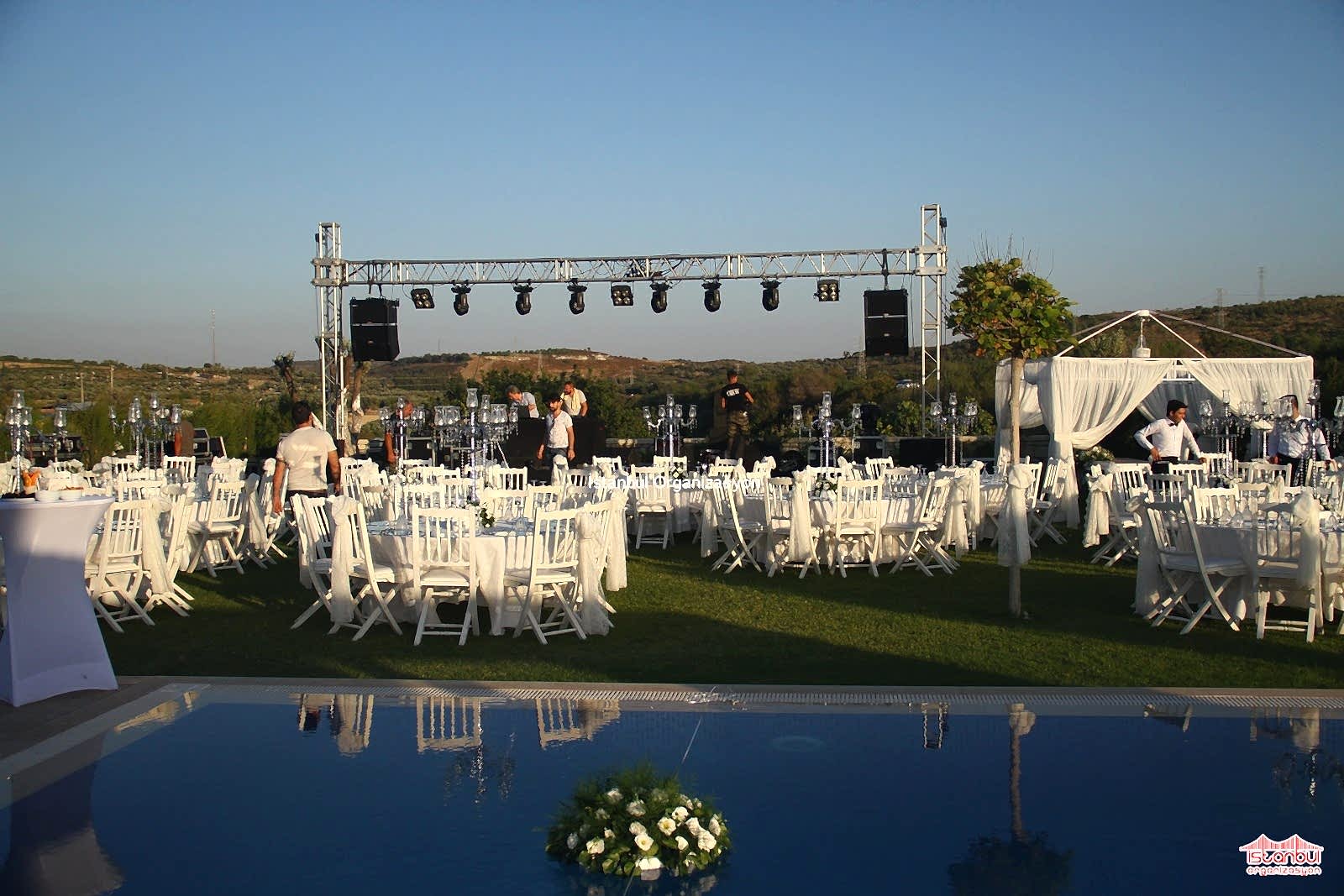 Düğün organizasyonu , belki de hayatımızın en özel en güzel günü. Sizler de kendi masalımızın birer kahramanı olmak için, bu günün üzerine titriyorsunuz. İstanbul Organizasyon olarak 12 yılı aşkın tecrübemizle ve vizyonumuzla bu eşsiz gününüzü unutulmaz yapmak için yanı başınızdayız. Siz mekana karar verin, ( kır, tekne, plaj, mekan vb. ), biz tecrübemizle sizi yönlendirelim, hayalinizdeki düğünü size anahtar teslim sunalım. Sizin seçeceğiniz mekana ve konsepte göre, masa sandalye düzenlemeleri ve tül süslemeleri, mekana uygun dekoratif objeler, çardak kurulumu ve çiçek süslemeleri hizmetleri ve ses sistemi, havai fişek, yer volkanları gibi teknik hizmetlerimiz sizin için ekibimiz tarafından yapılıyor.