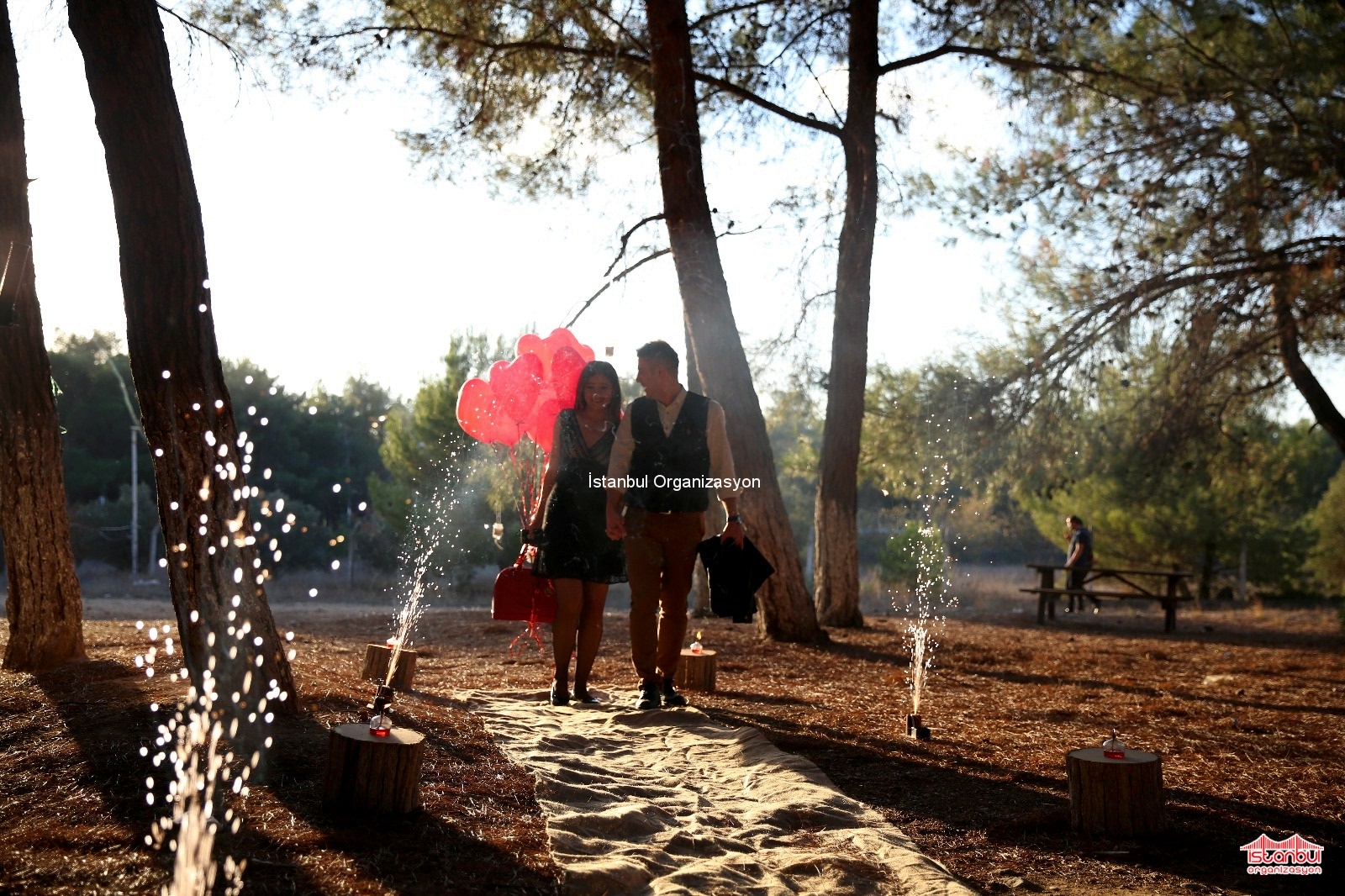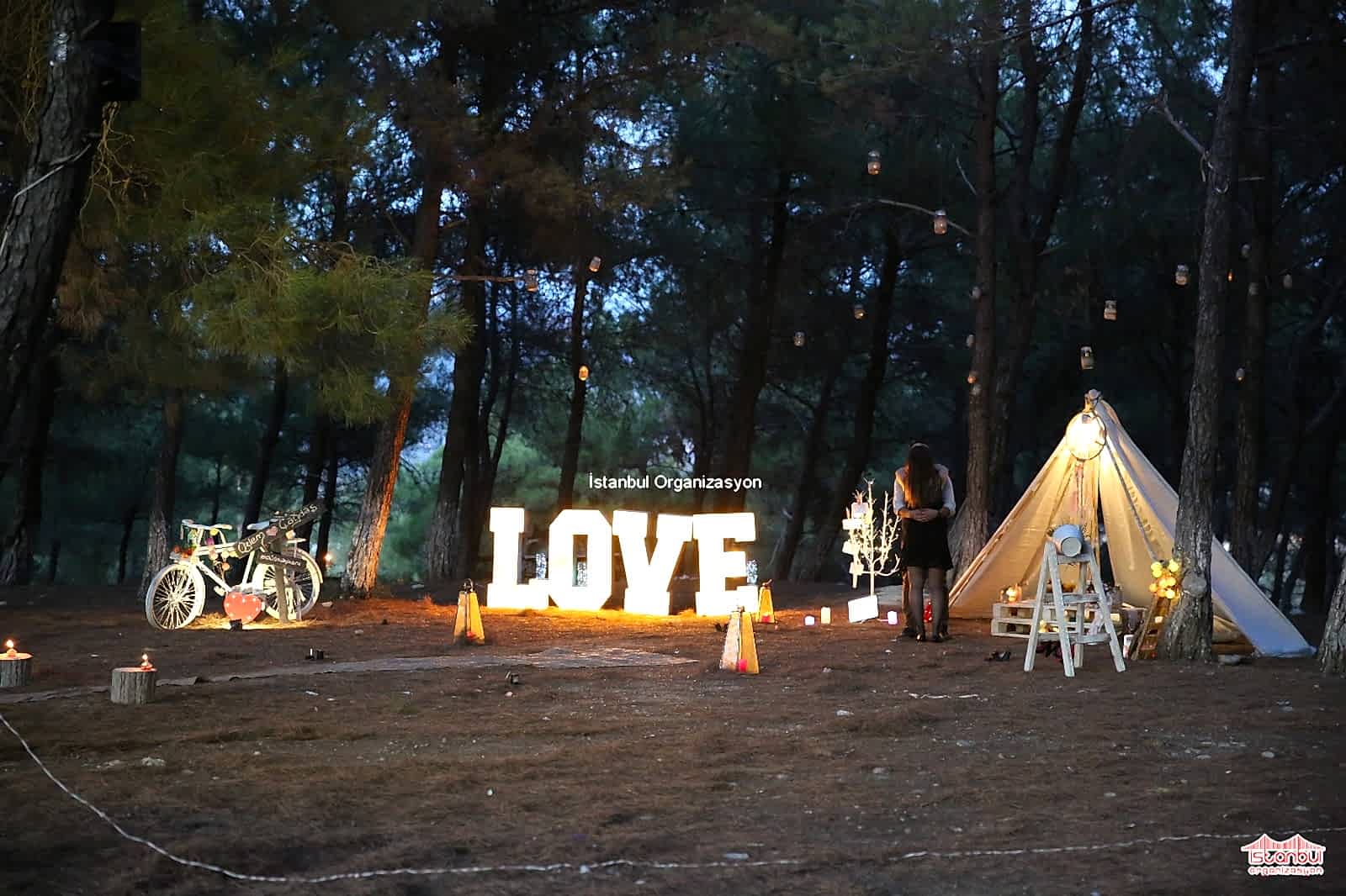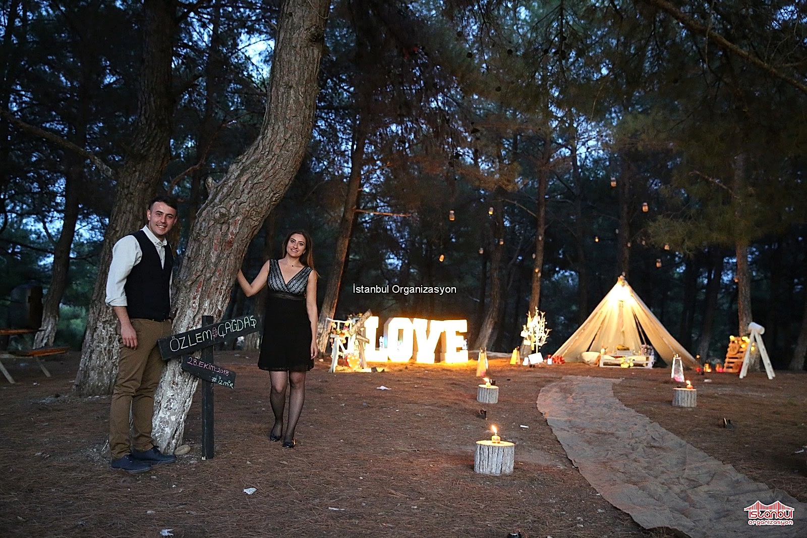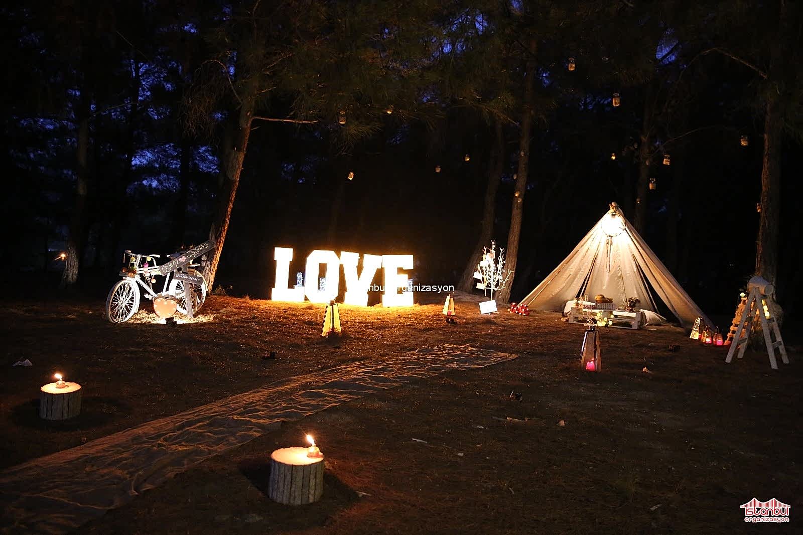 Düş kapanı evlilik teklifi organizasyonunuz için, planladığımız saatten ortalama üç saat önce kurulum başlar. Önce yürüyüş yolunuz oluşturulur. Girişe istediğiniz renkte halınız, uzaktan kumandalı yer volkanlarınız, fenerleriniz, mumlar, kandil lambaları, odunsu objeler, su bambularıyla hazırlanan Kızılderili üçgen çadırınız ve vakit geçireceğiniz snaek ikramlıklar yer alır. Tabi ki de o günü kutlamak adına patlatacağınız şampanyanız soğutulmuş ve kişiye özel tasarımıyla sizleri masanızda bekliyor olacaktır. Bulunduğumuz alan ormanlık bir bölge olduğu için ışıklandırmalar oldukça önemlidir. Ağaç aydınlatmaları, dev love ışıklı tabelası ve etrafta sizin daha önce sevdiğinizle çekilmiş fotolarınız bu evlilik teklifinize kimliğinizi koyacaktır. Diğer tüm detaylar siz ve sevgiliniz için İstanbul Organizasyon ekibimiz tarafından eksiksiz hazırlanıyor. Gün batımı yaklaşırken kurguladığımız gün haberleşip hazırız onayını alıp sizleri organizasyon alanına davet ediyoruz.