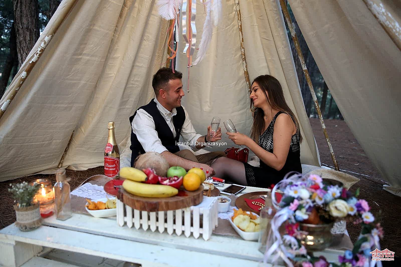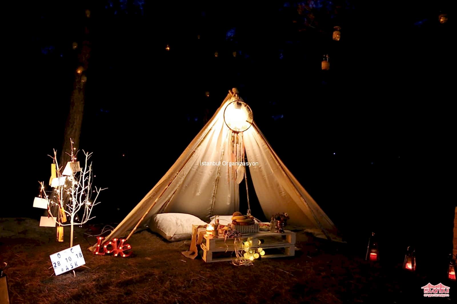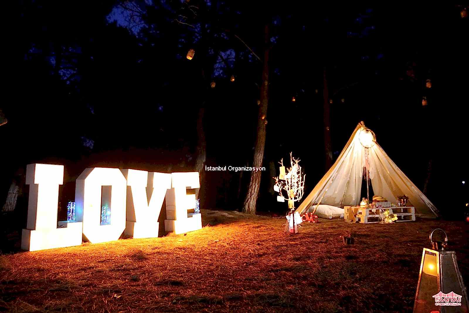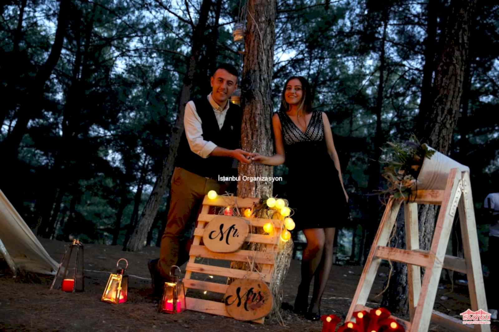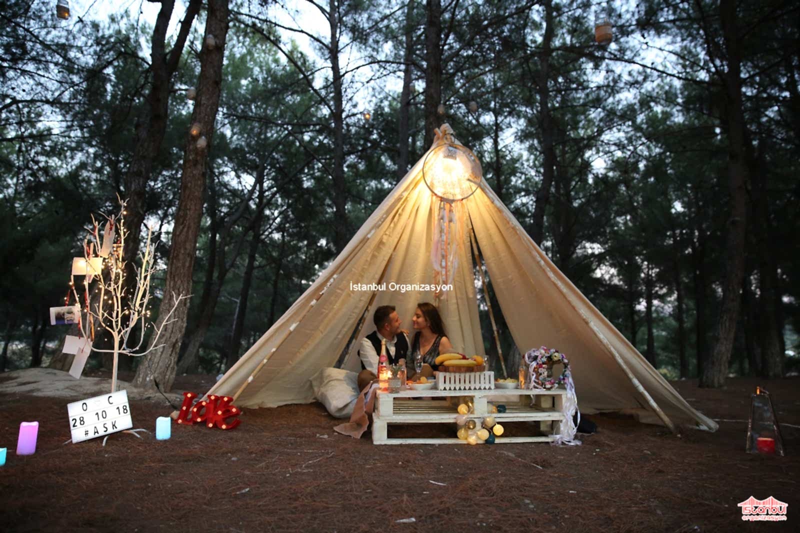 Düş kapanı evlilik teklifi organizasyonunuz için, planladığımız saatten ortalama üç saat önce kurulum başlar. Önce yürüyüş yolunuz oluşturulur. Girişe istediğiniz renkte halınız, uzaktan kumandalı yer volkanlarınız, fenerleriniz, mumlar, kandil lambaları, odunsu objeler, su bambularıyla hazırlanan Kızılderili üçgen çadırınız ve vakit geçireceğiniz snaek ikramlıklar yer alır. Tabi ki de o günü kutlamak adına patlatacağınız şampanyanız soğutulmuş ve kişiye özel tasarımıyla sizleri masanızda bekliyor olacaktır. Bulunduğumuz alan ormanlık bir bölge olduğu için ışıklandırmalar oldukça önemlidir. Ağaç aydınlatmaları, dev love ışıklı tabelası ve etrafta sizin daha önce sevdiğinizle çekilmiş fotolarınız bu evlilik teklifinize kimliğinizi koyacaktır. Diğer tüm detaylar siz ve sevgiliniz için İstanbul Organizasyon ekibimiz tarafından eksiksiz hazırlanıyor. Gün batımı yaklaşırken kurguladığımız gün haberleşip hazırız onayını alıp sizleri organizasyon alanına davet ediyoruz.