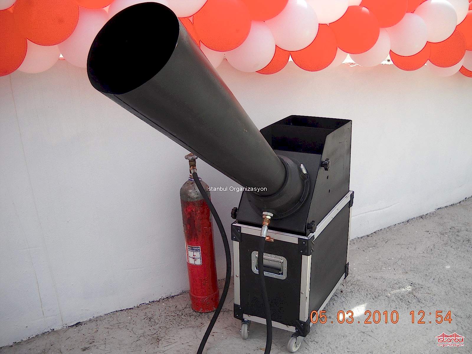 - Gazlı Konfeti : Gazlı konfeti, karbondioksit gazı ile çalışan pro teknik bir makinedir. 170 cm x 40 cm x 80 cm ve 120 cm x 35 cm x 70 cm ölçülerinde olan farklı boyutları mevcuttur. İçerisine isteğe göre gramajı ayarlanabilen renkli ve parlak kağıtlar konulur. Kağıtların püskürtüleceği mesafe ayarlanır. Karbondioksit gazının basıncıyla kağıtlar havaya püskürür ve gösteri başlamış olur. İsteğe göre kağıtların gideceği mesafe 3 metre ile 15 metre arasında ayarlanabilir. organizasyon mekanının uygunluğu, organizasyonun büyüklüğü ve davetli sayısı gibi faktörlere bağlı olarak gazlı ayarlamalar yapılabilir.