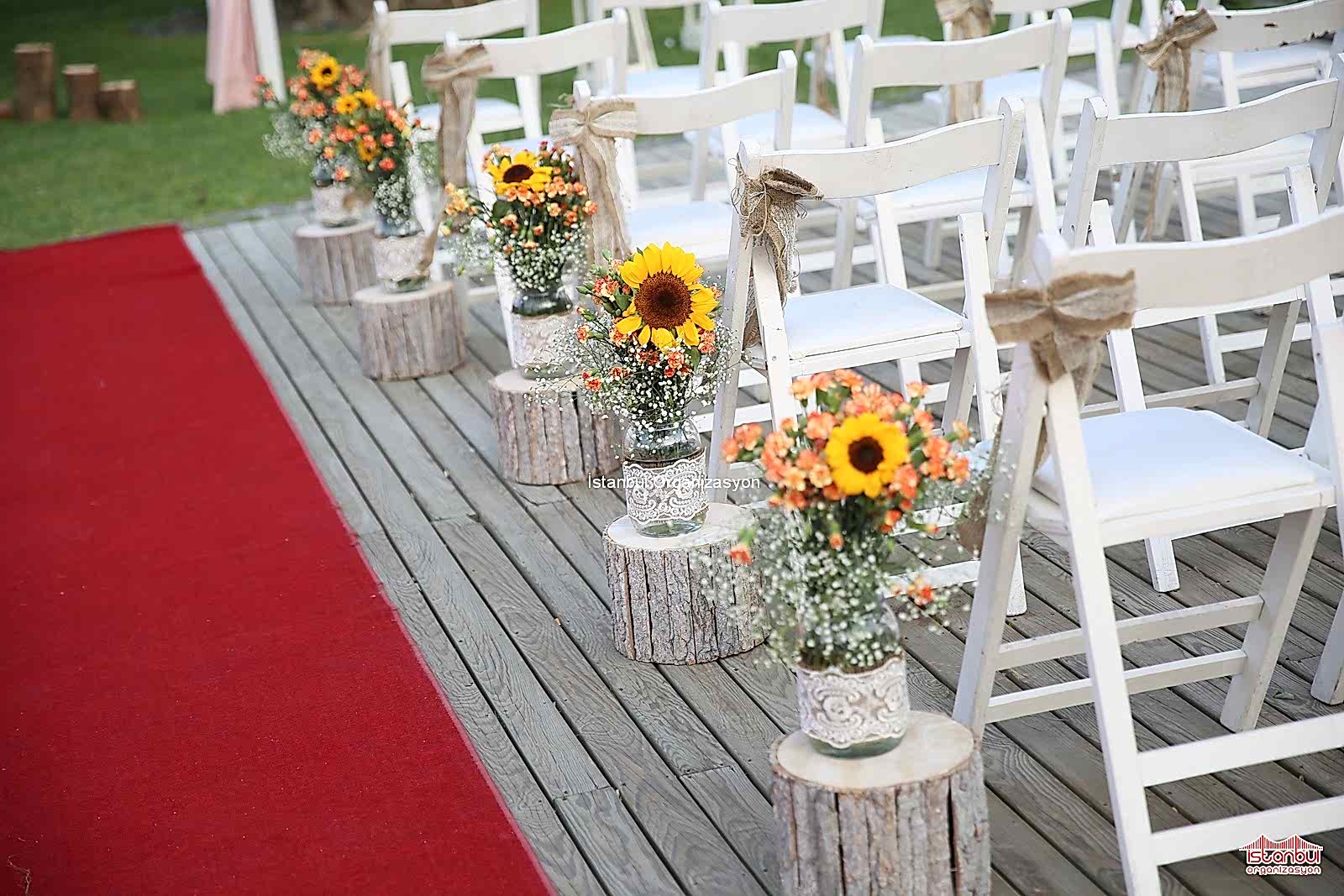Düğün organizasyonlarında; gelin çiçeği, yürüyüş yolu, nikah masası, nikah şekeri, şamdan gibi alanlarda ve objelerde çeşitli kumaş ve rafya süslemeler yaparak konsepte uygun bir düğün süslemesi yapıyoruz. Örneğin, kumsal düğün organizasyonlarında doğal rafya ( saman rafya olarak da biliniyor ) kullanarak, daha doğal, salaş ve şık bir görüntü elde ediyoruz. Özellikle gazebonun kenarlarına bağladığımız doğal rafyalar, rüzgarın da etkisiyle kumsal düğün organizasyonlarında çok şık bir dekoratif süsleme oluyorlar.