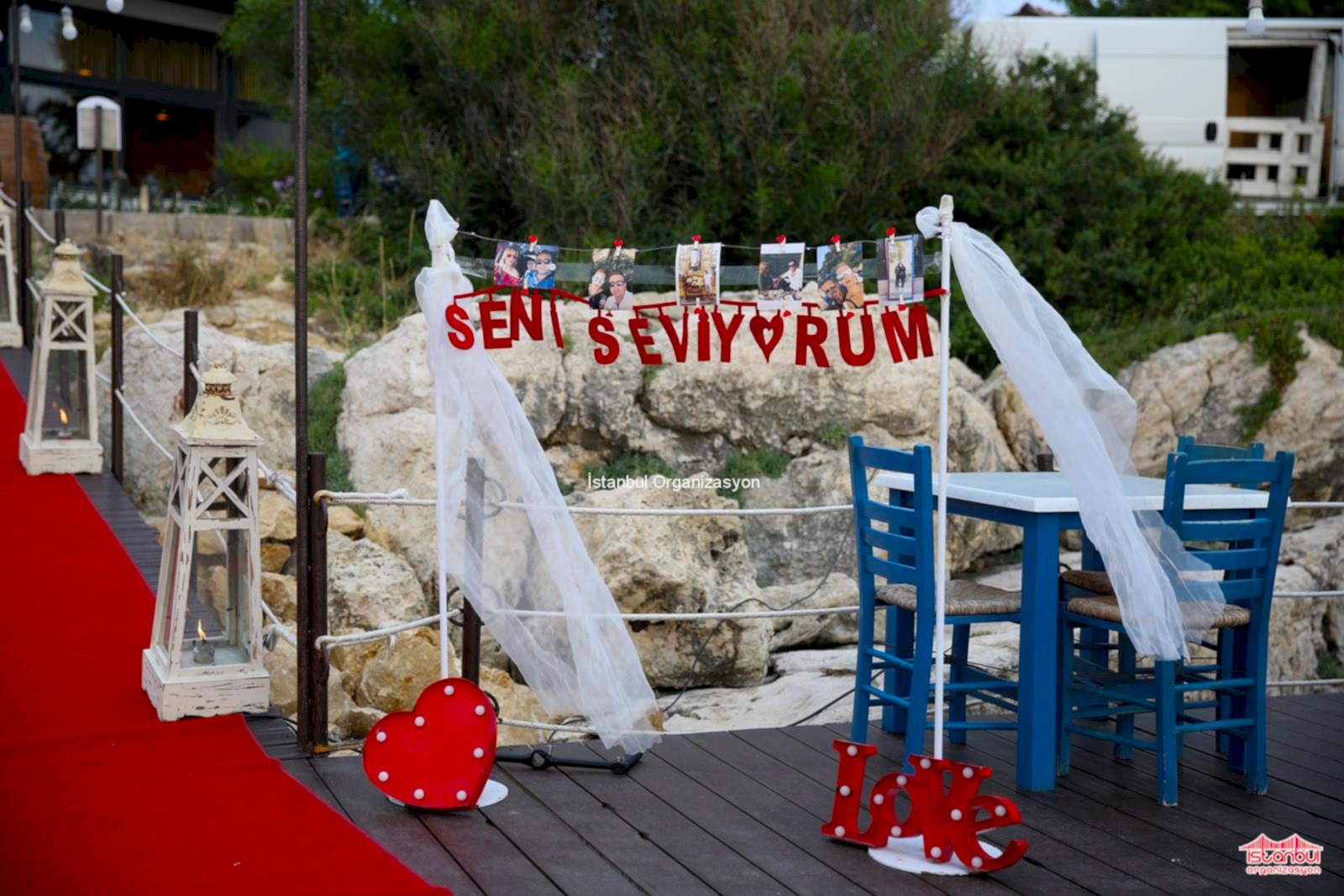 Kuşadası iskelede evlilik teklifi organizasyonu için takvimlerden yaprakları bir bir koparıp organizasyon gününe geldiğimizde İstanbul Organizasyon ekibimiz Kuşadası’na gitmek üzere hazırlıklarını tamamlamıştı. Organizasyondan yaklaşık 3 saat önce belirlediğimiz lokasyona ulaştık. Bu süre zarfında Mert Bey ile iletişimde kalmaya devam ettik. Ekibimiz iskeleye ekipmanlarımızı özenle götürerek hemen hazırlıklara başladı. Kırmızı halıyı çiftimiz için yere serdik. Yanlarına ise eskitilmiş ahşap denizci fenerlerini ve yer volkanlarımızı yerleştirdik. Cam vazolarımızın içerisini ise Sinem Hanımın sevdiği çiçeklerle yani papatyalarla süsledik. Yürüyüş yolunun sonunda bistro masamızı konumlandırarak üzerine çiftimiz için kadehleri, şampanyayı, çiçek buketini ve Sinem Hanıma hediye etmek üzere müzik kutusunu yerleştirdik. Teknik ekibimiz ses sisteminin kurulumunu tamamladı ve ‘Benimle Evlenir Misin’ yazılı strafor harfler bistro masanın yanında yerini aldı. Tırabzanlar da kırmızı kalpli balonlarımızı da hazırladıktan sonra hemen hemen her şey tamamlanmıştı. Son olarak Sinem Hanıma takdim etmek üzere uçan balonlarımız hazırlandı. Hazırlıklarımızı bitirdikten sonra son kontrollerimizi yaptık.