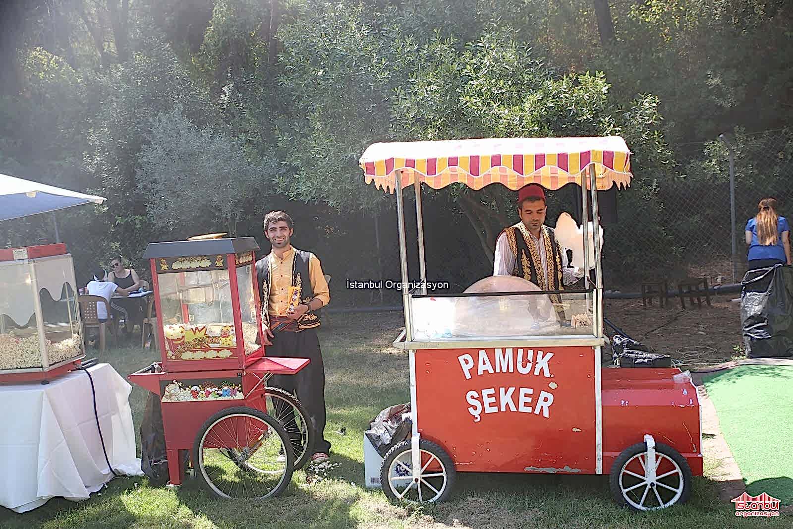 Sünnet organizasyonu gibi eğlenceli kutlamalarda hem çocuklara hem de yetişkinlere hitap eden patlamış mısır, pamuk şeker gibi ikramlar yapabilirsiniz.