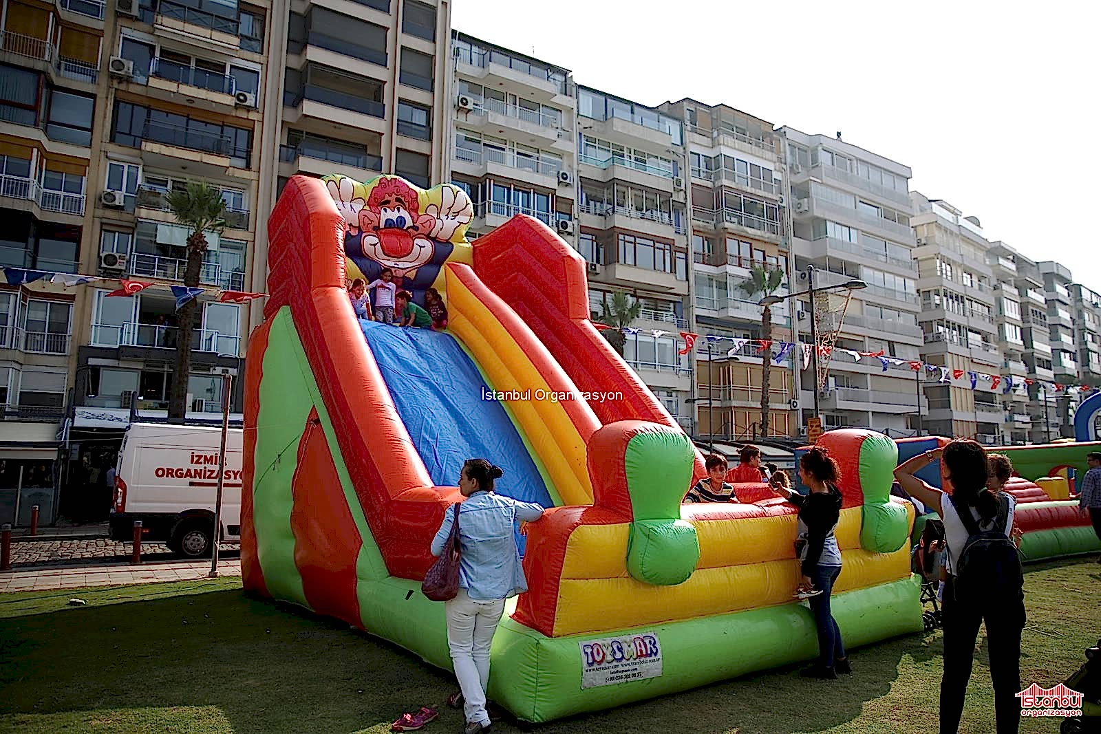Dev Palyaço Kaydırak; dev palyaço kaydırak şişme oyun parkurunda palyaço teması bulunmaktadır. 7 metre uzunluğunda, 5 metre genişliğinde ve 8 metre yüksekliğinde olan dev palyaço kaydırakta tırmanma merdivenleri yardımıyla çocuklar yukarı çıkarak şişme zeminden kaymaktadır. Şişme oyun parkurunun nakliyesi ve kurulumu İstanbul Organizasyon ekibimiz tarafından tamamlanmaktadır. Oyun parkurunun başında bulunan sivil animatörümüz de organizasyonda çocukların güvenliğini sağlamak açısında görevlendirilir.