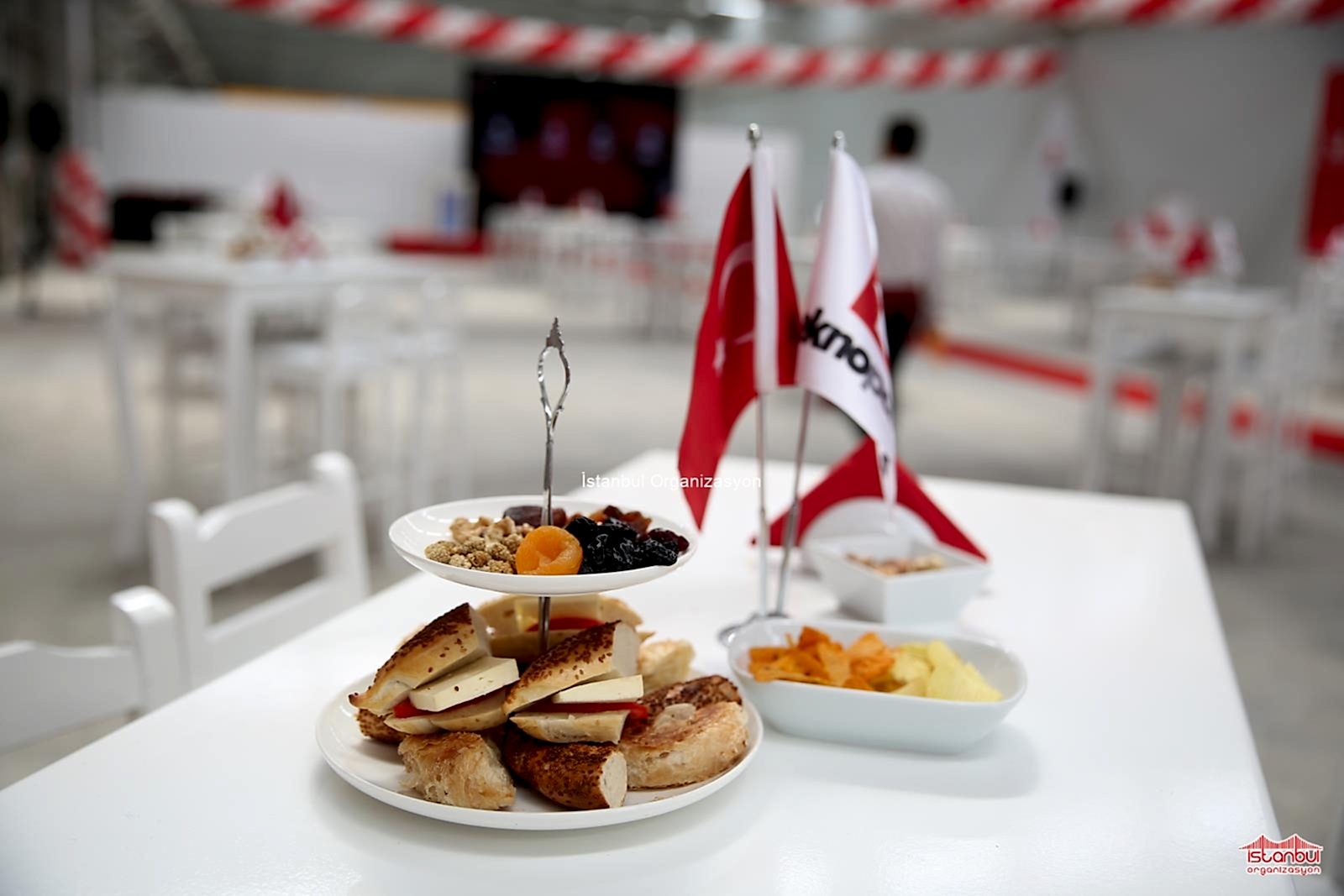 Gevrek, mini kumru, kuru meyveler, cipz ve çerez tabakları servis elemanlarımız ve garsonlarımız tarafından özenle hazırlanarak bistro masaların üzerinde yerini aldı. İzmir lokma standı da hazırlandıktan sonra Turgutlu Teknopanel açılış organizasyonu için hazırlıklarımız bitmişti. Son kontrollerimizi yaptıktan sonra tüm ekibimiz yerlerini aldı. Organizasyonun başlamasına az bir zaman kalmıştı artık. Kısa bir süre sonra davetlilerde Turgutlu Teknopanel açılış organizasyonu için katılım sağlamaya başladı.